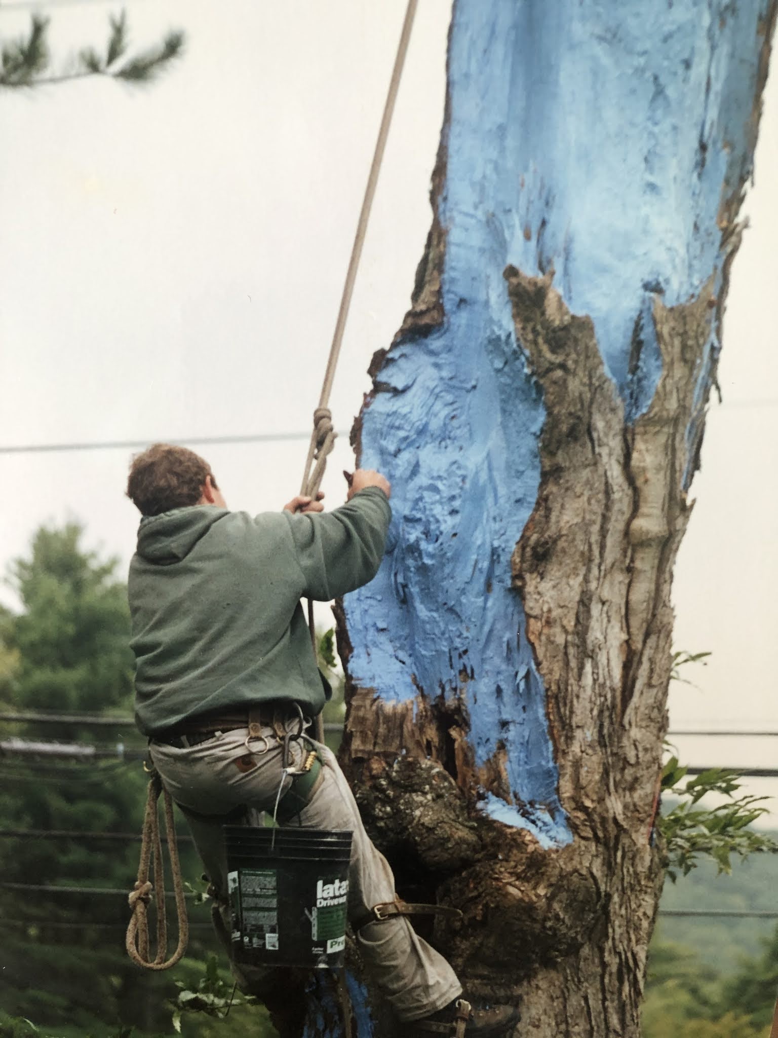 Over the next few days, I painted. Once I’d climbed as high as I dared on the stepladder, I phoned a young man in town and he donned a leather harness and hoisted himself up 30 feet and swung there, right above the main road, and he painted the very top of the tree blue. The neatest thing about the blue color of the tree is that it is exactly the same color as the sky, so that if you looked up, the top of the broken tree seems to disappear into the ethos.